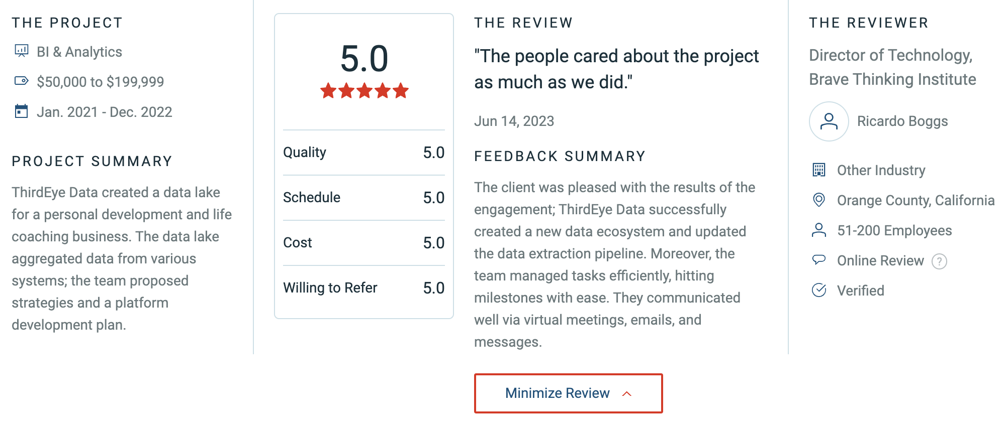 "ThirdEye Data was able to get inside our tech environment and set up the data lake fairly quickly.” Manager of Enterprise Data Services, Media Company