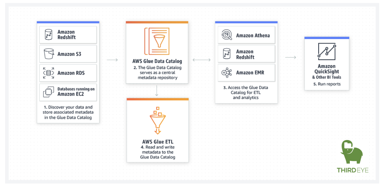 You can use the AWS Glue Data Catalog to quickly discover and search across multiple AWS data sets without moving the data. Once the data is cataloged, it is immediately available for search and query using Amazon Athena, Amazon EMR, and Amazon Redshift Spectrum.