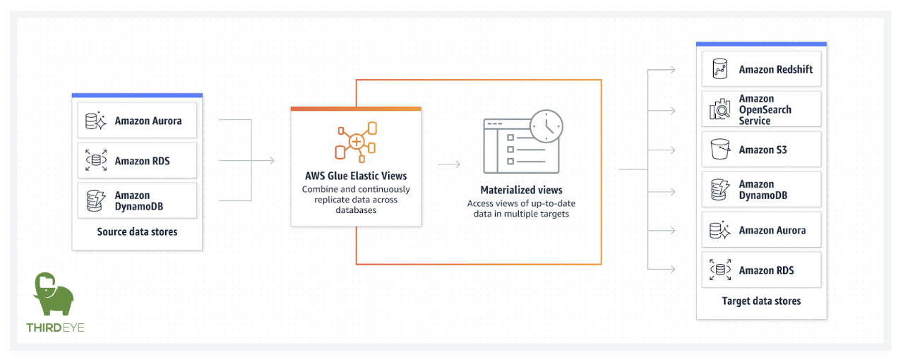 AWS Glue Elastic Views enables you to use familiar SQL to create materialized views. Use these views to access and combine data from multiple source data stores, and keep that combined data up-to-date and accessible from a target data store. The AWS Glue Elastic Views preview currently supports Amazon DynamoDB as a source, with support for Amazon Aurora and Amazon RDS to follow. Currently supported targets are Amazon Redshift, Amazon S3, and Amazon OpenSearch Service, with support for Amazon Aurora, Amazon RDS, and Amazon DynamoDB to follow. Learn more about AWS Glue Elastic Views here.