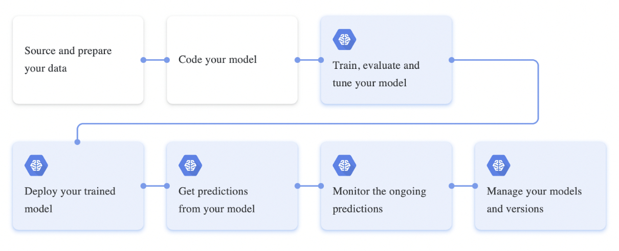 The diagram below gives a high-level overview of the stages in an ML workflow. The blue-filled boxes indicate where AI Platform provides managed services and APIs: